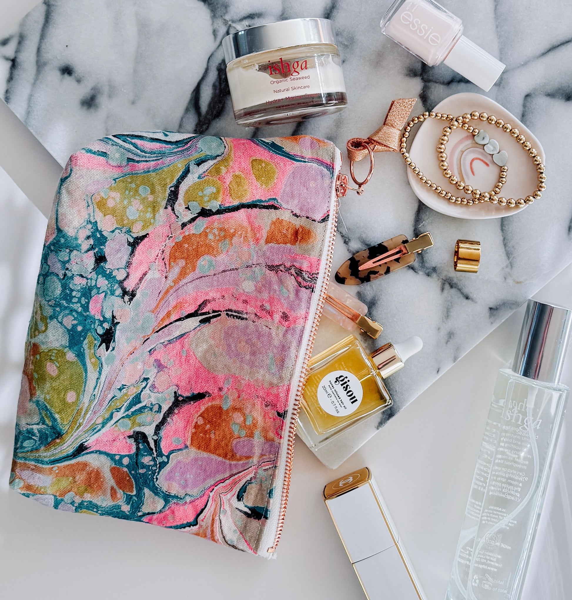 Hand marbled panels of mill end cotton canvas are done in studio and then sewn into these marvelous canvas pouches perfect for all sorts of objects and accessories, or to use as a cute clutch. Unlined with recycled metallic leather zipper pull.  All Marbled fabric is one of a kind. Minor imperfections are inherent of the process. Every one is hand made to order.  Large enough to carry a lot of products!