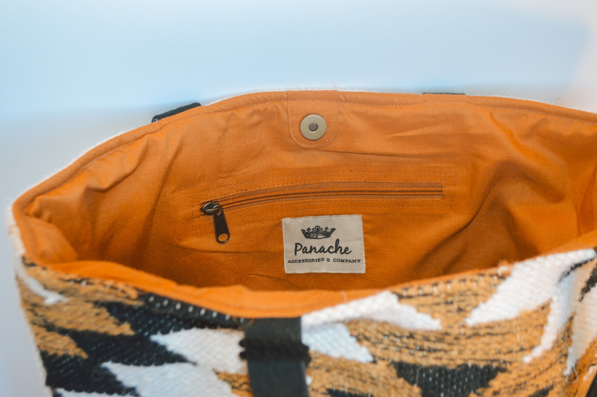 Aztec White, Brown, Black Aztec Boho Tote With Pom Tassel.