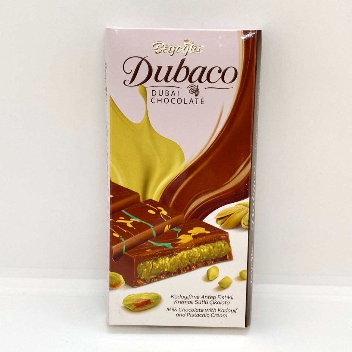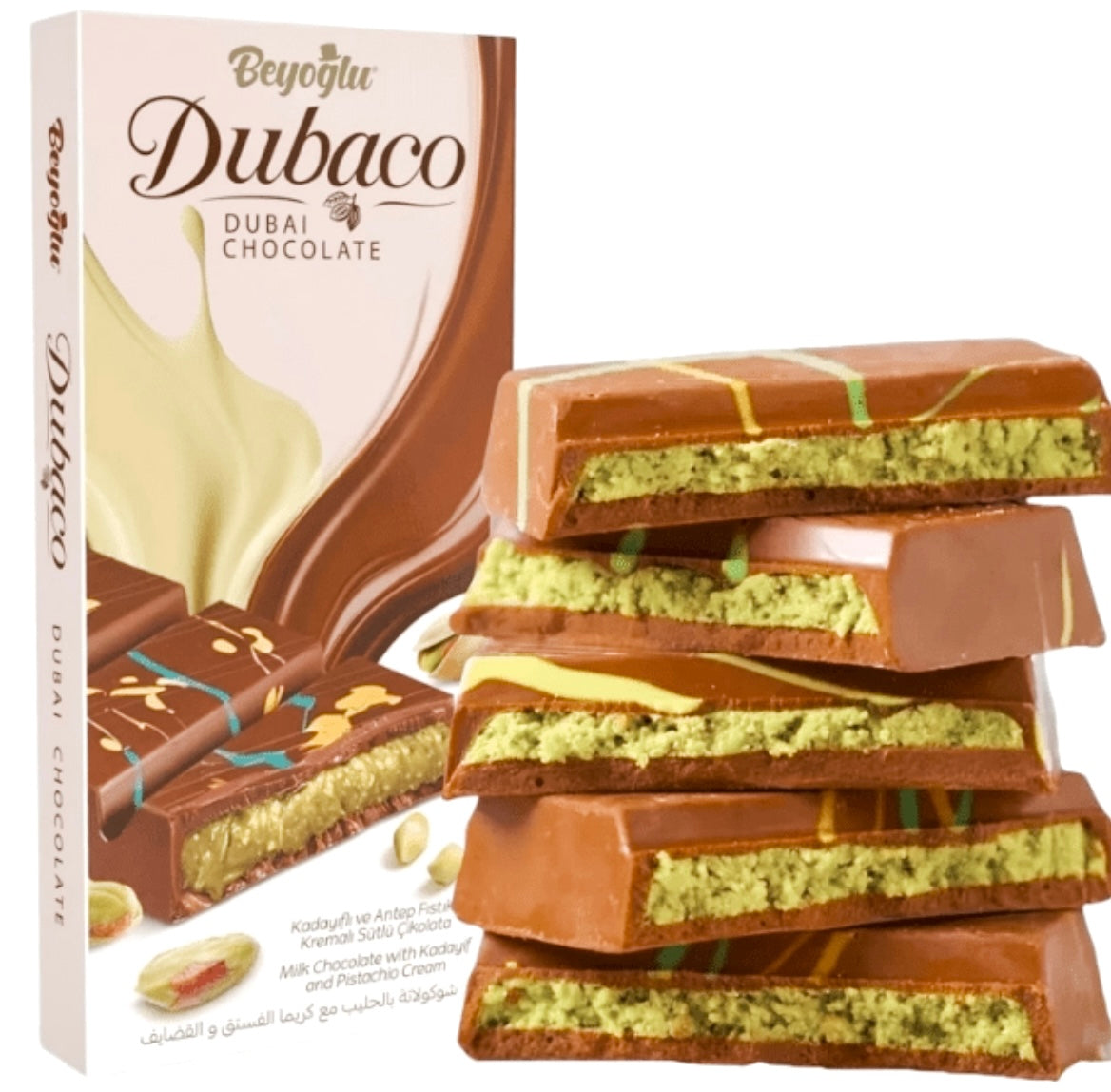 Experience Dubai's Sweetness with Beyoglu Dubaco Crispy Kadayif Milk Chocolate - 200g A Premium Blend of Creamy Milk Chocolate, Crunchy Kadayif, and Rich Pistachio Cream Indulge in the exotic flavors of the Middle East with Beyoglu Dubaco Crispy Kadayif Dubai Milk Chocolate, a luxurious 200g