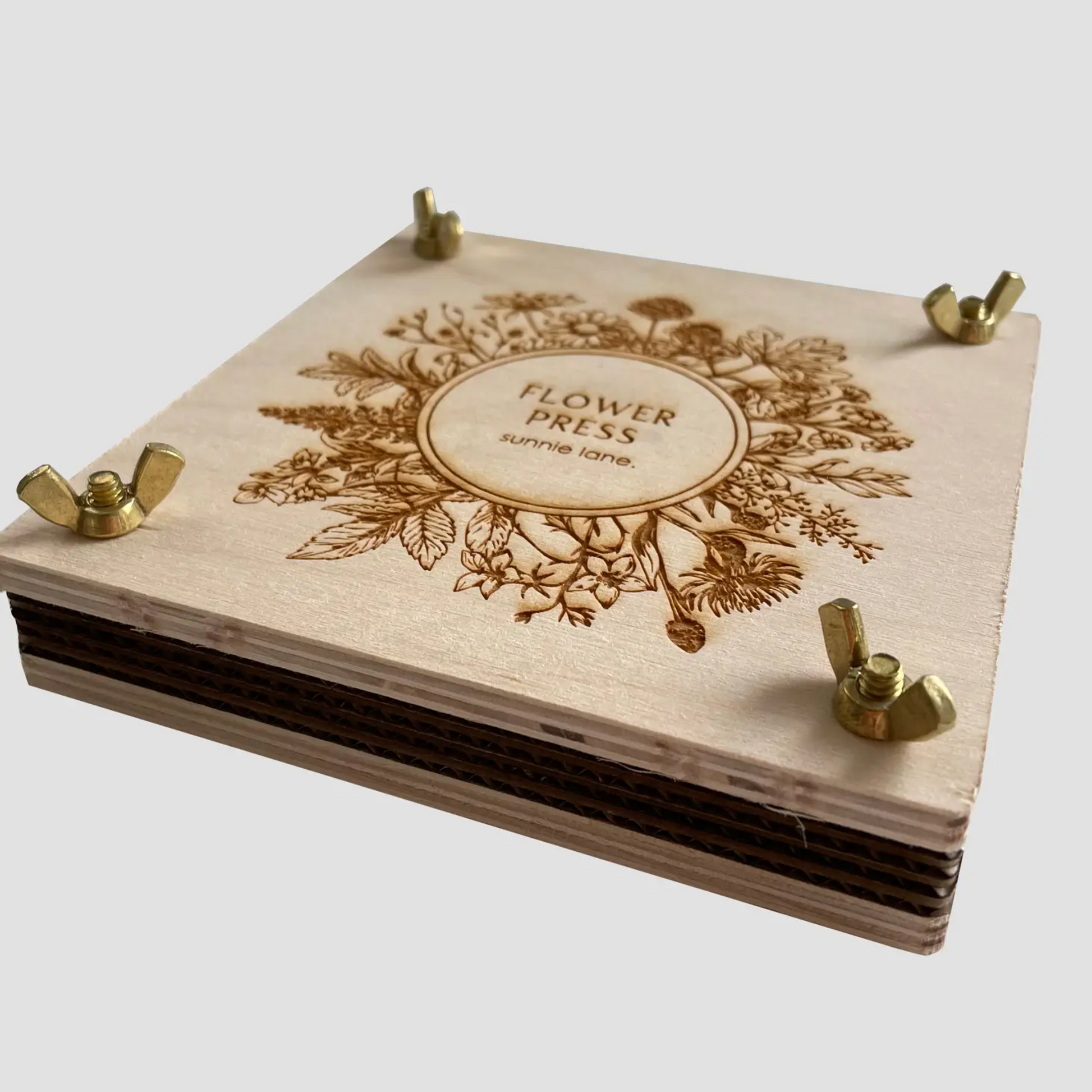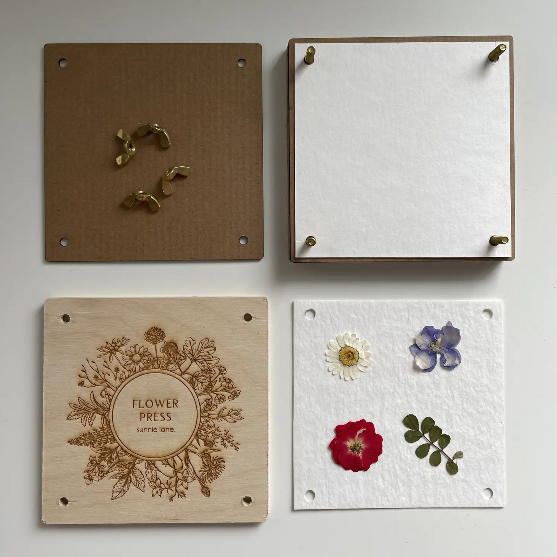 Our flower press is a beautiful and functional piece that can press multiple flowers at the same time. Having pressed flowers for 30+ years, our flower press has all the components needed to successfully press your own flowers! Each floral press comes with clear instructions on how to properly use it. These flower presses are the perfect fall floral gift. The press is offered in a natural wood and white and has a beautiful floral design etched into it. They not only press flowers really well but they are also a beautiful decor piece for a tabletop, counter, etc. Little Details: - Each press is 4.75" X 4.75" - The natural wooden press has brass hardware. The white press has nickel hardware. - Instructions included with each flower press - Each press comes assembled and ready to use