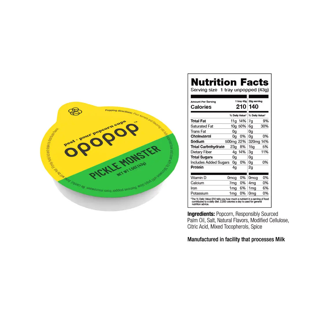 Requires a popper- these are unpopped popcorn kernels Meet our Pickle Monster Peel + Pour Pop Cups. They're supremely snackable and amazingly delicious. Whether you have the mid-day munchies or need a late-night snack, this will fulfill your craving. Don’t be afraid of the dill. Nothing is as dill-licious as this. Pickle Monster will be your go-to snack with the perfect balance of sour, salty, and savory. When the popportunity arises, simply peel, pour + pop.