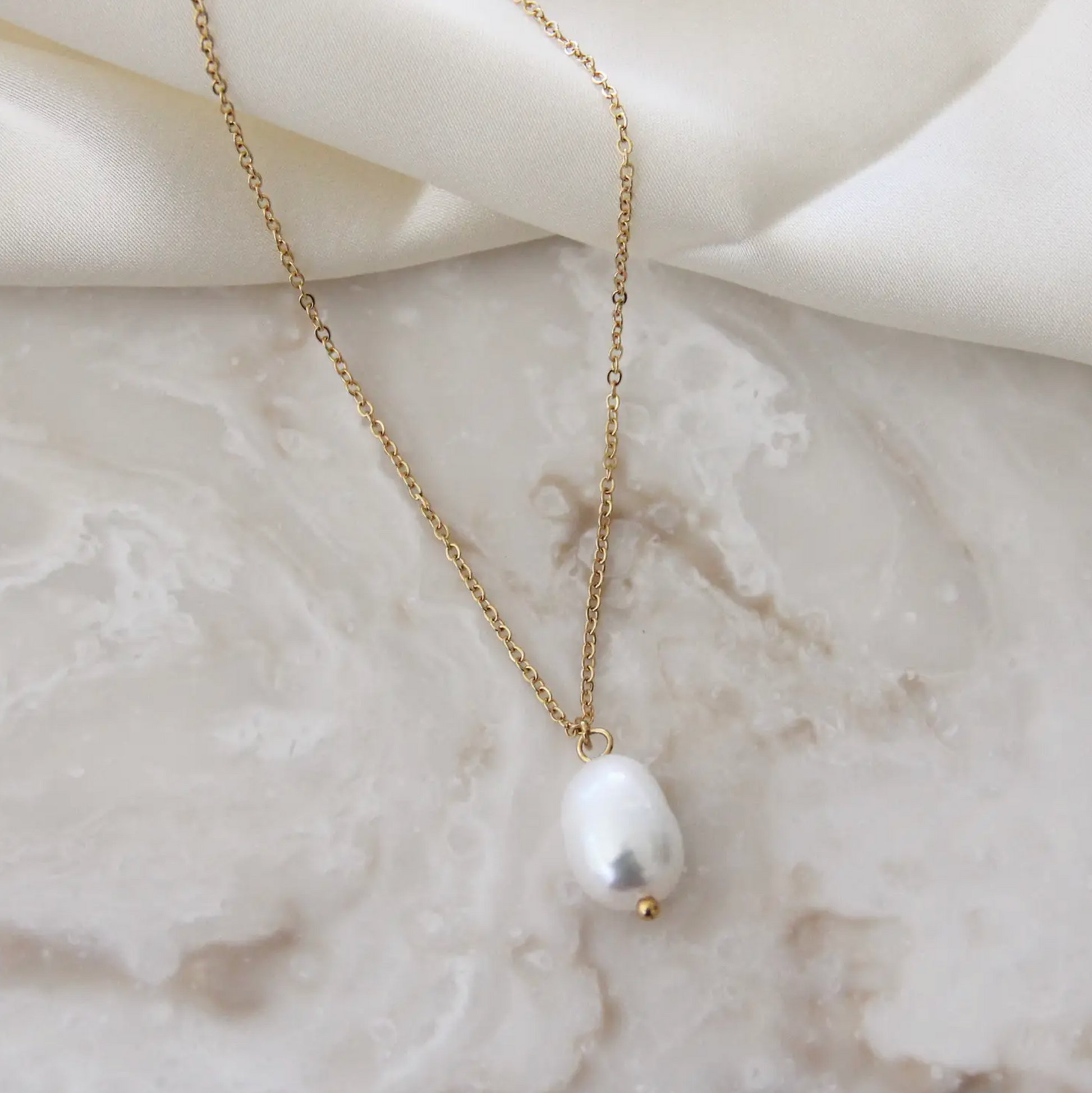 Natural Freshwater Pearl Drop Necklace • This listing is for one (1) necklace • Measurement: 14mm Freshwater Pearl • Material: Natural Freshwater Pearls. Because these pearls are natural, each piece you receive will be beautifully unique and may vary in size • Length: 18" + 4" extender. Lengthens up to 22" • Finish: 18K Gold or Surgical Steel. Waterproof and Tarnish Resistant • Base Metal: Surgical Steel • Nickel Free and Lead Free. Hypoallergenic • All our jewelry is packaged in signature MAIVE jewelry pouches